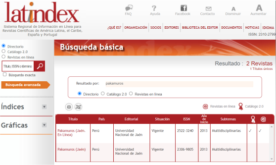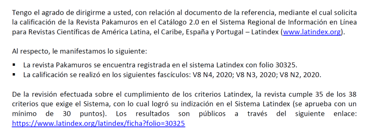 En el documento oficial, indica que, la Revista Científica Pakamuros se encuentra registrada en el sistema Latindex con folio 30325, tras obtener una calificación de los fascículos: V8 N4, 2020; V8 N3, 2020; V8 N2, 2020. En ese sentido, la revista cumple con 35 de los 38 criterios que exige el sistema (https://www.latindex.org/latindex/ficha?folio=30325).